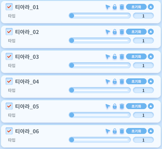 총 6개의 디자인의 티아라로 구성 되어있으며 각각 서로 다른 타입 개수를 지원합니다.