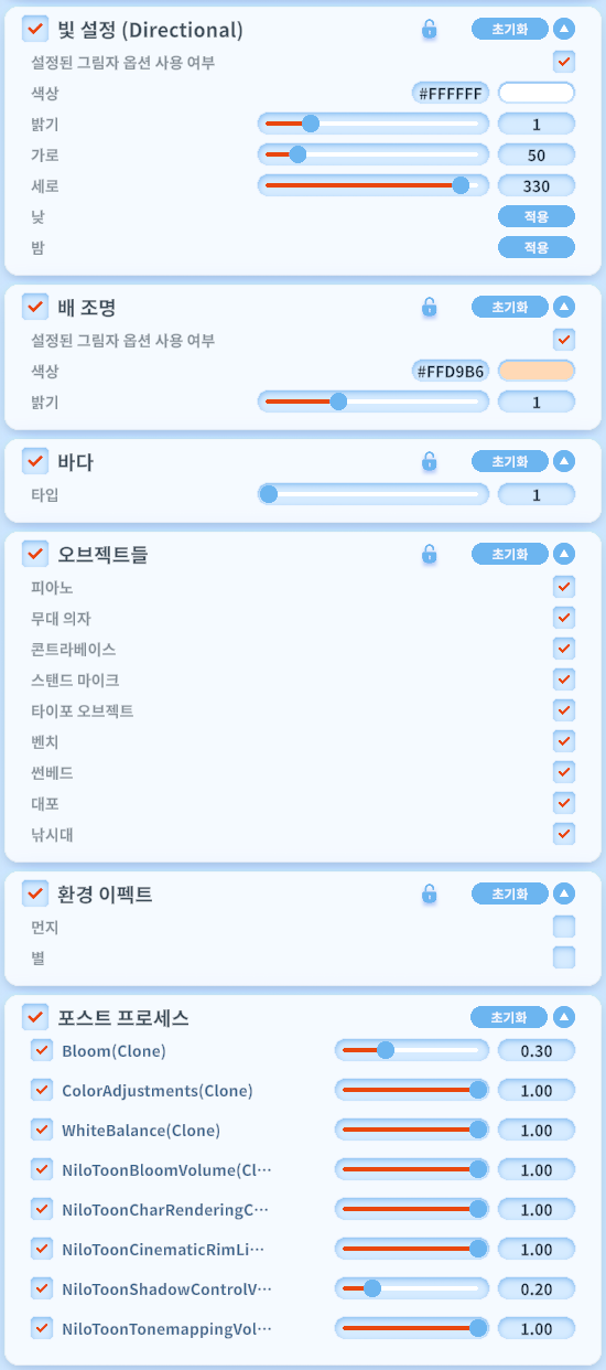- 조명, 이펙트, 오브젝트 ON/OFF 가능