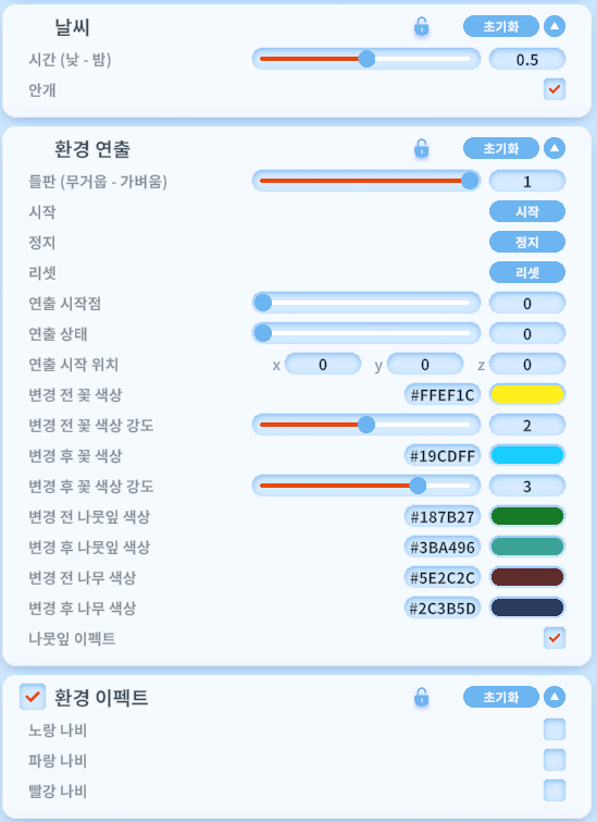 환경 연출 기능이 있어, 지정된 색상으로 꽃과 나무의 색을 바꾸는 연출을 재생할 수 있으며, 변경된 상태로 고정하여 사용 할 수 있습니다.