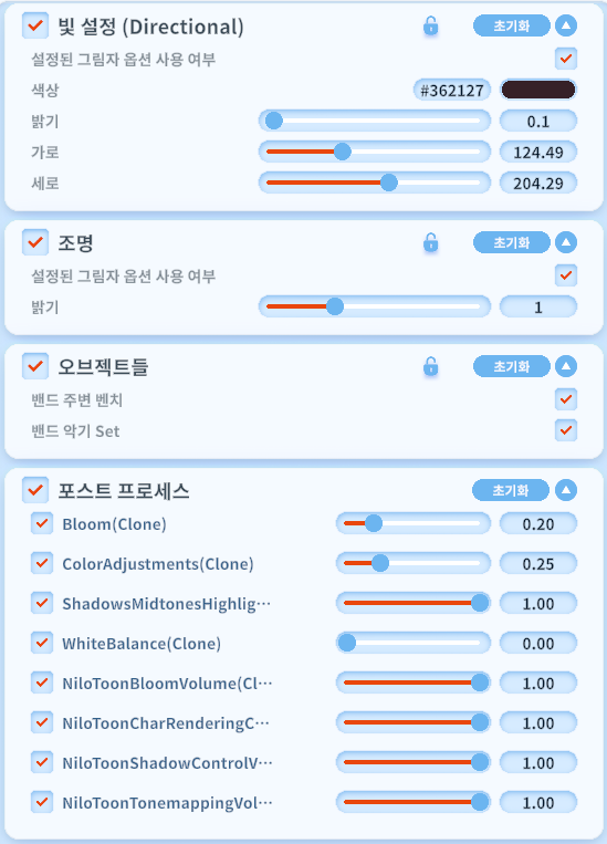 밤 버전에서는 배경에 배치된 조명의 밝기 조절이 가능합니다.